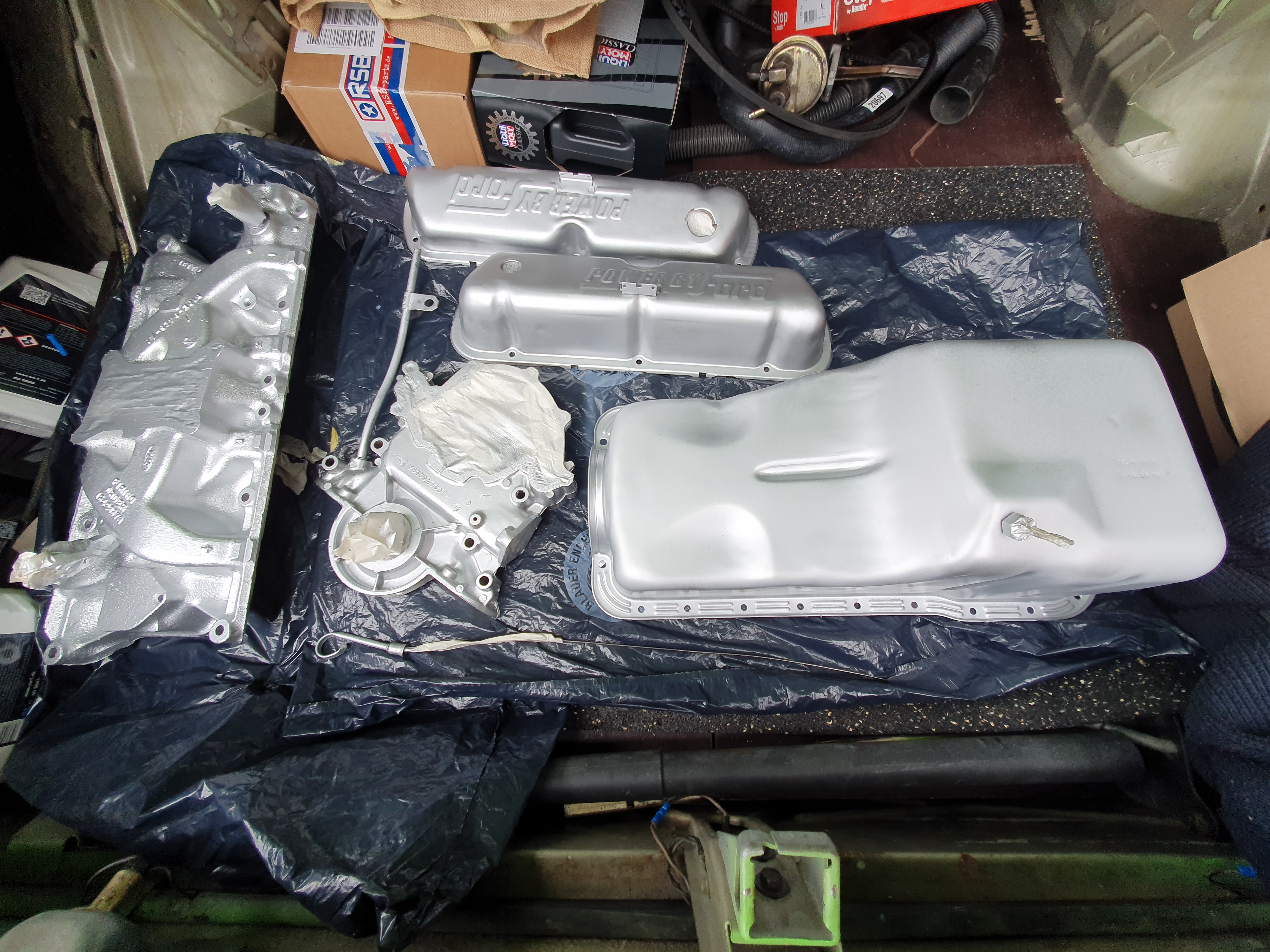 Motorraum ist vorbereitet, soll heißen ordentlich gereinigt, Schläuche und Kabel erneuert, bzw überholt, Mattschwarz lackiert, ich mach morgen mal ein Foto.