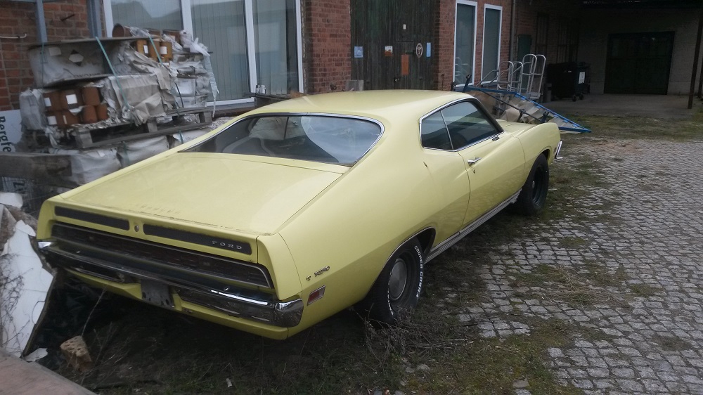 es handelt sich um einen gelben 1971 Torino GT Sportsroof 351-4V Cleveland mit Matching Numbers in einem guten Zustand, noch nicht geschweißt, kleine Durchrostungen im Fußraum, Inneraum und Kofferraum demontiert, viele Teile wieder neu Aufgearbeitet.